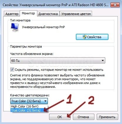 то заходим в дополнительные параметры (как в пункте 2 решения моей проблемы), идем на вкладку “Монитор” и внизу там есть переключатель режимов качества цветопередачи. Так вот там нужно выбрать 32 бита (True Color):