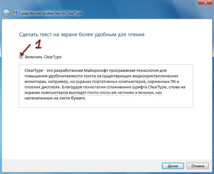 Слева в меню заходим в “Настройка текста ClearType”. И в появившемся окне ставим галочку “Включить ClearType”. При этом на мониторе сразу можно увидеть изменения и понять, что к чему. Нажимаем кнопку далее и выбираем наилучшие для вас варианты текста. Там не сложно, поэтому скриншоты приводить не буду.