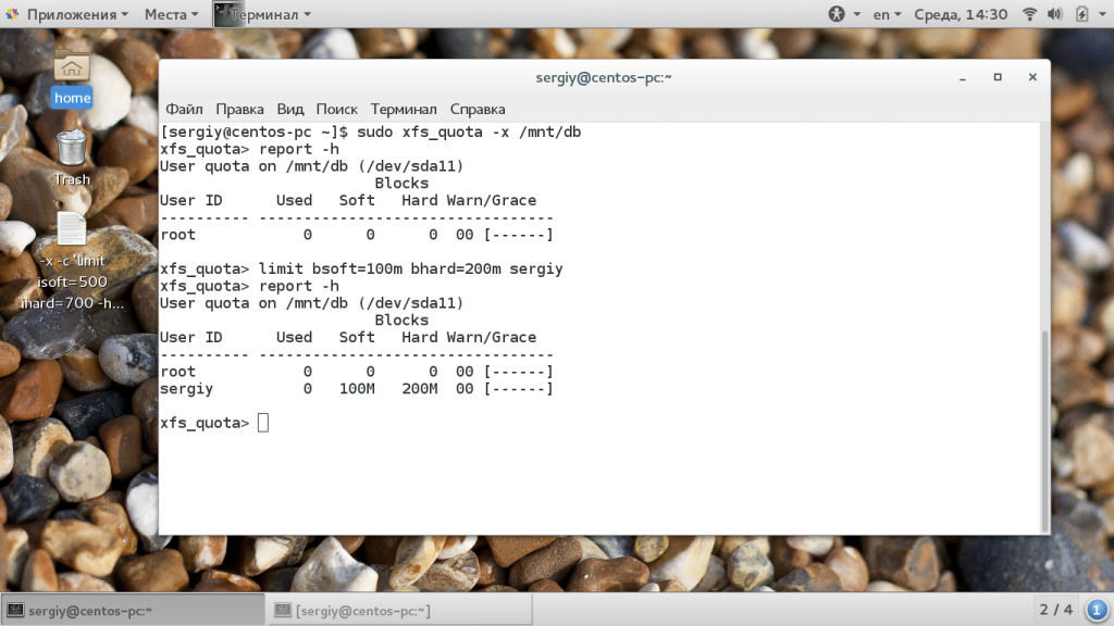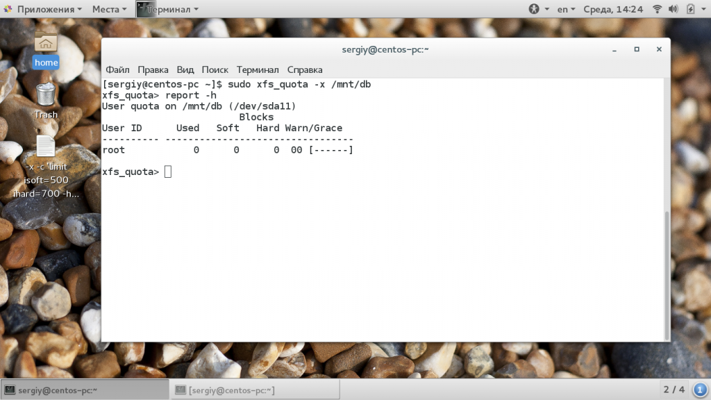 Дальше эти же опции желательно добавить в /etc/fstab для этой файловой системы. Теперь рассмотрим как настроить XFS квоту. Сначала запустите утилиту xfs_quota для каталога, куда смонтирована XFS: