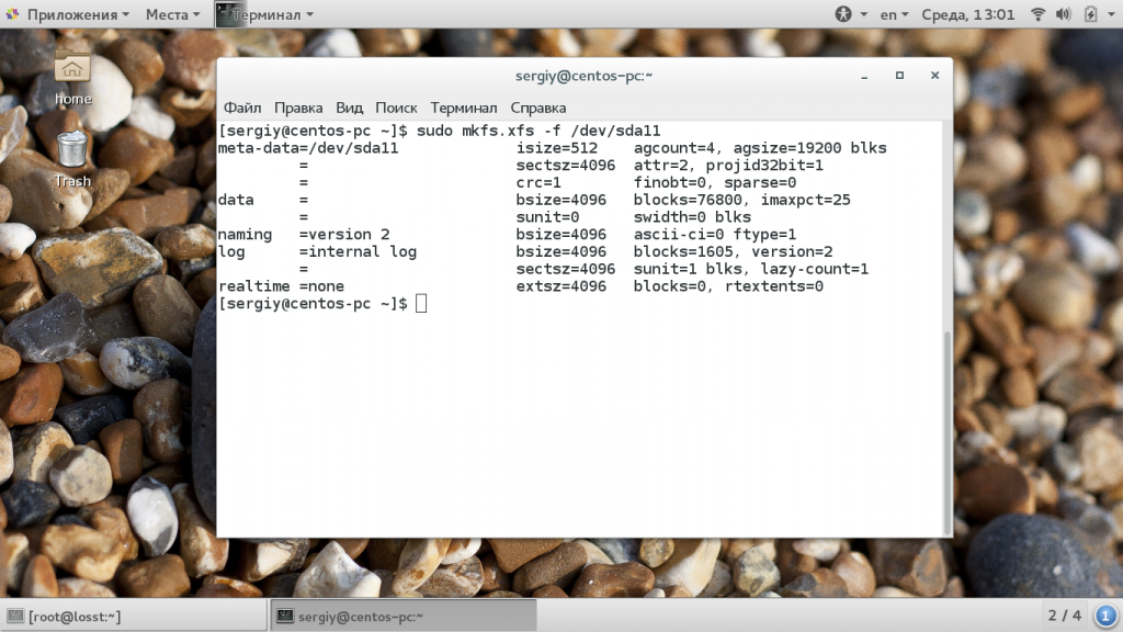 Я буду предполагать, что у вас уже есть готовый раздел для создания файловой системы. Если нет, вы можете создать его с помощью утилиты Gparted или fdisk. Я буду предполагать, что раздел, на котором необходимо создать файловую систему XFS — это /dev/sda11. Это можно сделать с помощью стандартной утилиты mkfs: