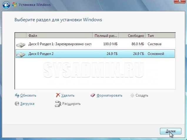 Второй способ осуществить форматирование жесткого диска через BIOS – с помощью установщика Windows. Для этого после выбора языка нажимаем «Далее».
