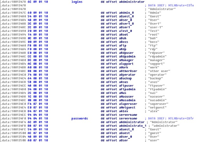 - Выполняется перебор учетных записей и паролей по жестко зашитому в коде словарю