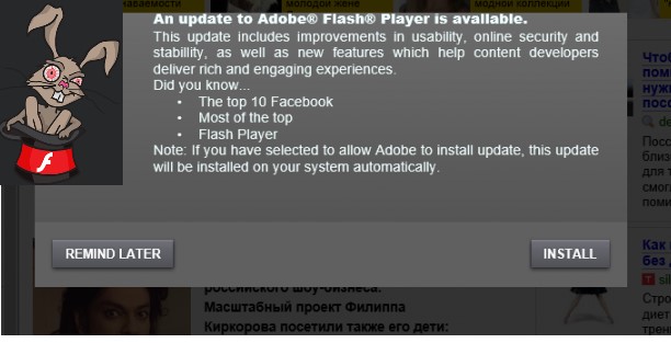 Большинство заражений вирусом Bad Rabbit пришлось на Россию, затем идут Украина, Турция и Германия. Судя по всему, распространение вируса началось с нескольких взломанных злоумышленниками крупных СМИ сайтов (в основном в доменных зонах .ru и .ua), на которые был внедрен JS код поддельного уведомления о необходимости обновить Adobe Flash Player. В том случае, если пользователь соглашается с обновлением и запускает скачанный с сервера злоумышленников файл install_flash_player.exe (по словам сотрудников Касперского скачивание происходит с сайта hxxp://1dnscontrol[.]com)