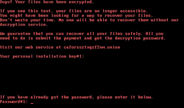 Кроме того, файл dispci.exe используется для установки модифицированного загрузчика, который препятствует нормальной загрузке системе (по аналогии с NotPetya). Модифицируется код в MBR и загрузчик перенаправляется на файл, отображающий текст сообщения шифровальщика и «уникальный код пользователя». В тексте сообщения указывается адрес сайта в Tor для получения кода расшировки.