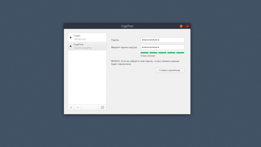 Как видно на изображении у меня уже создано одно криптохранилище.