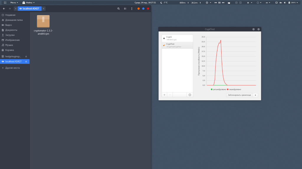 В него и необходимо копировать данные для шифрования, для примера я скопировал .rpm пакет самого приложения. В окне программы будет отображаться график с процессом шифрования/расшифровки, красной и зеленой линией для процесса шифрования и расшифровки соотвественно.