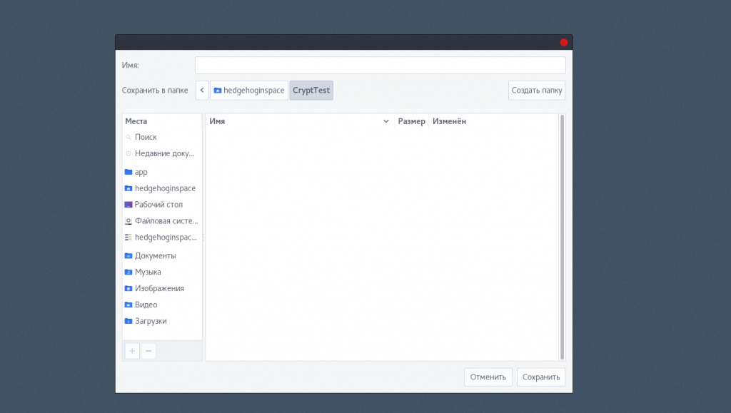 Нажимаем кнопку «+» в левом нижнем углу, открывается файловый менеджер, где необходимо выбрать место хранения (рекомендую папку автоматически синхронизируемую с облачным сервисом) и название зашифрованного файла и его название.