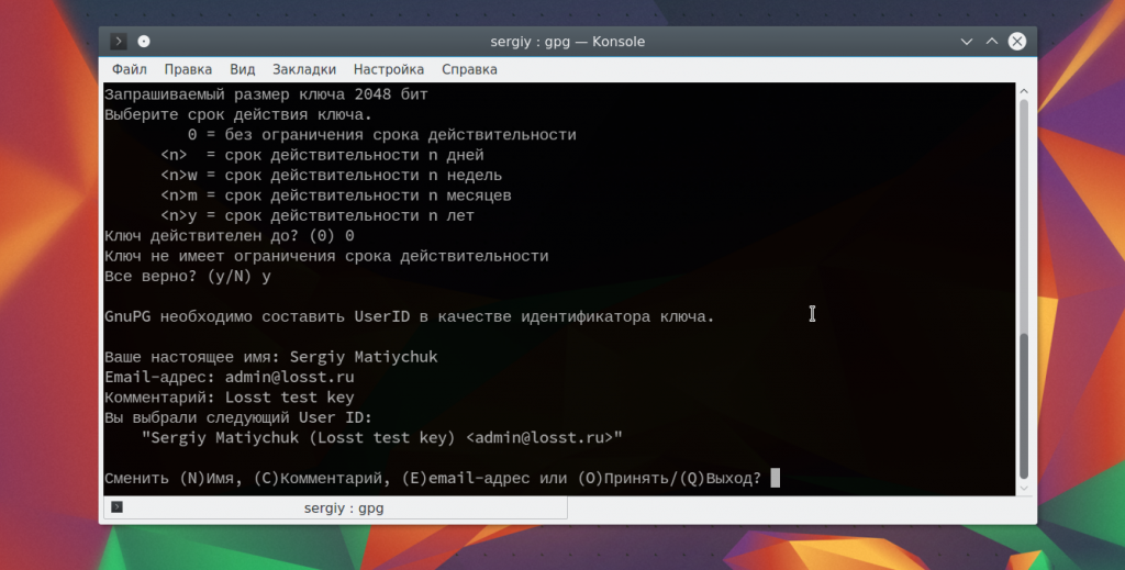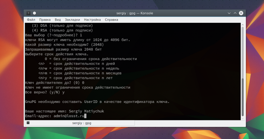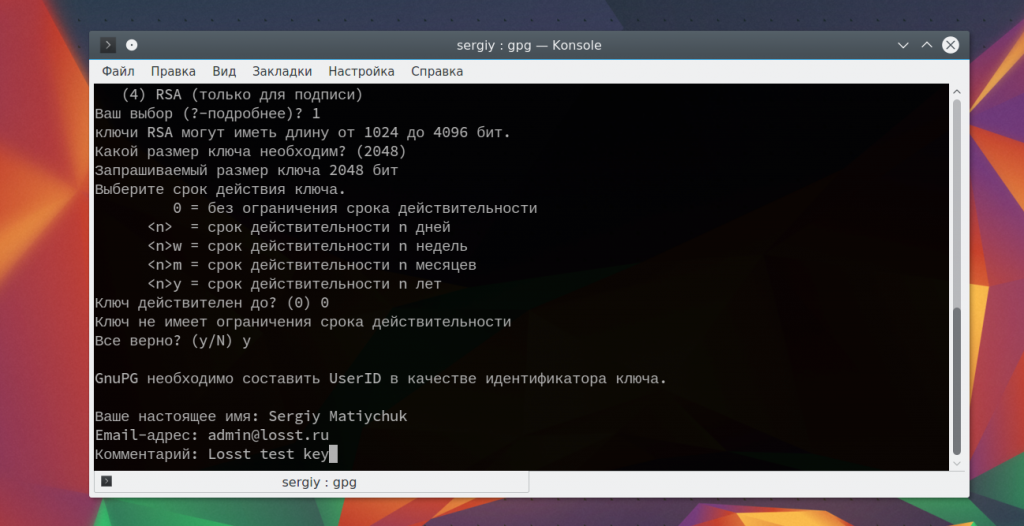 Сначала необходимо настроить gpg, создать пару ключей, для этого наберите: