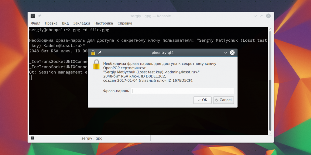Утилита создаст файл с расширением gpg. Для расшифровки используйте: