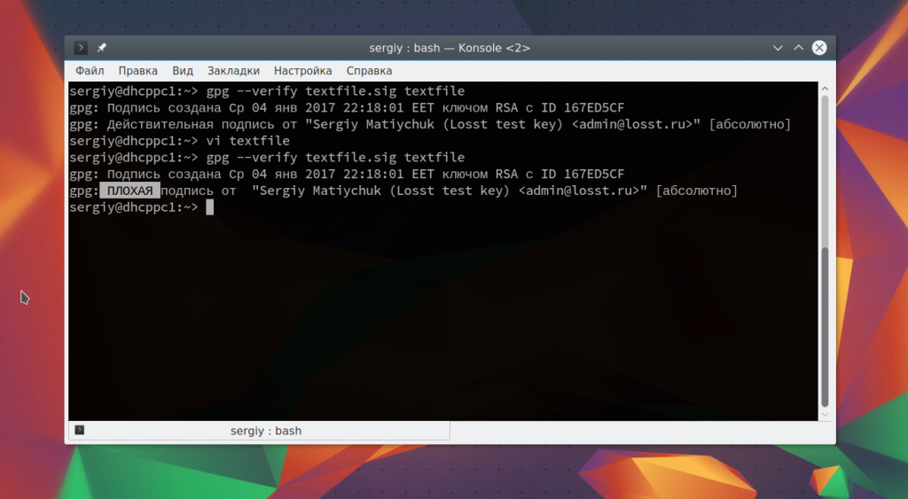 Тогда в каталоге, рядом с файлом появиться файл .sig с подписью. Дальше, чтобы проверить достаточно использовать команду verify:
