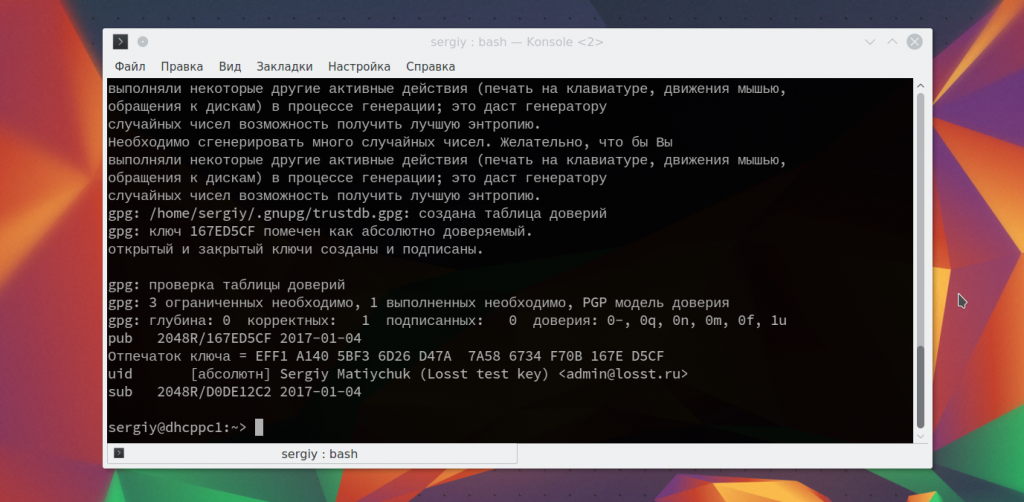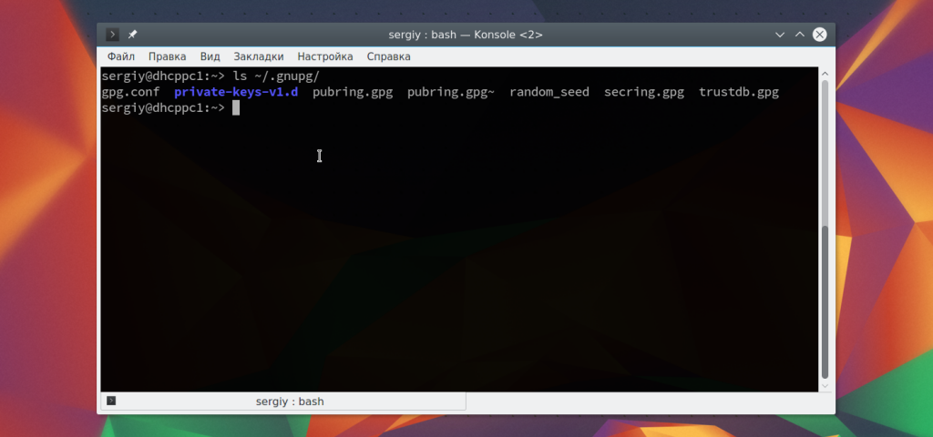 Процесс генерации может занять некоторое время. Когда все будет готово в каталоге ~./gnupg появятся два файла. В файле pubring.gpg публичный ключ, а в secring.gpg приватный.