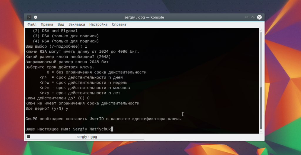 Введите имя нового ключа, фактически, это имя пользователя, но вы будете использовать его чтобы зашифровать файл linux, поэтому выбирайте обдумано.