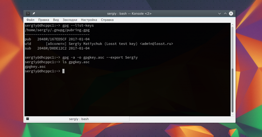 gpg -a -o gpgkey.asc --export имя_ключа