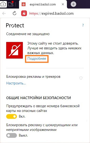 - В верхней части появившегося окна, где написано про незащищенное соединение, нажимаем на надпись «Подробнее».