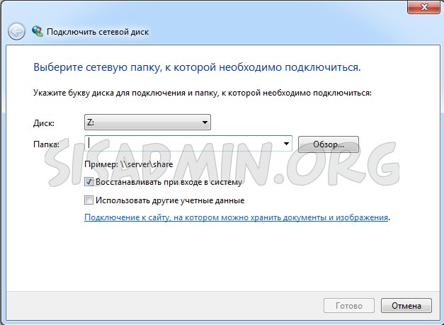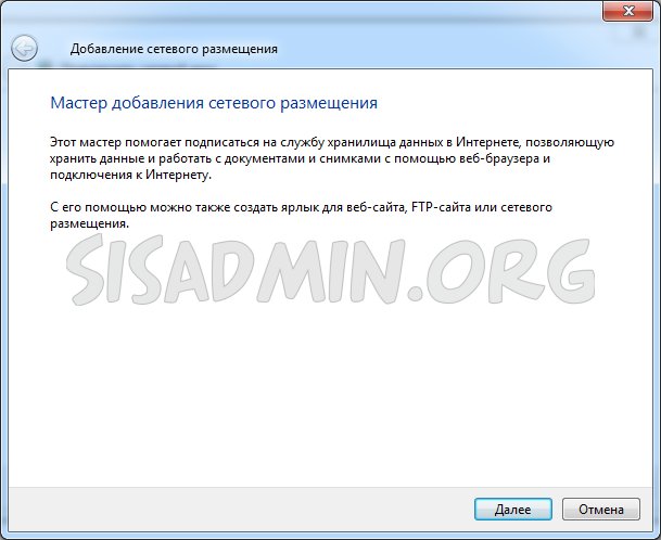 - Откроется мастер подключения сетевого диска. Ничего не заполняем и выбираем пункт «Подключение к сайту, на котором можно хранить документы и изображения», который находится в самом внизу окошка.