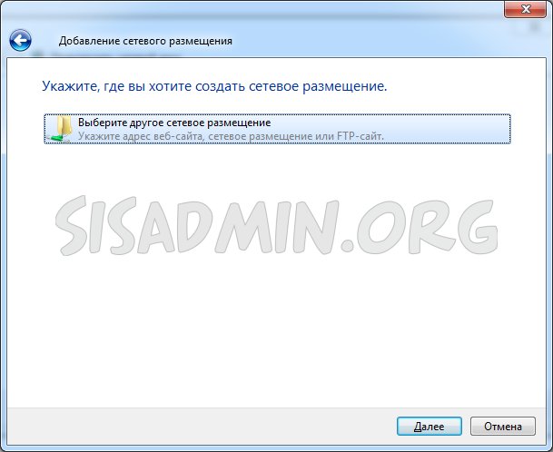- Выбираем единственный пункт «Выберите другое сетевое размещение», опять жмем «далее».