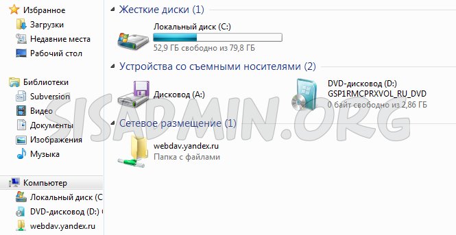 - Теперь в «Моем компьютере» присутствует сетевое размещение с вашим яндекс диском: