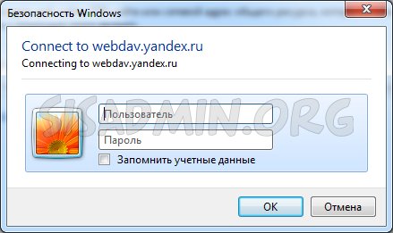 - Откроется частично нерусифицированное окно, где потребуется ввести ваш логин и пароль от учетной записи Яндекса. При желании устанавливаем галочку «Запомнить учетные данные», нажимаем кнопку «Ок».