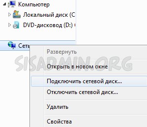 - Для начала откроем Мой компьютер, и в боковой панели на ярлыке «Сеть» кликаем правой кнопкой мыши, и выбираем пункт «Подключить сетевой диск».