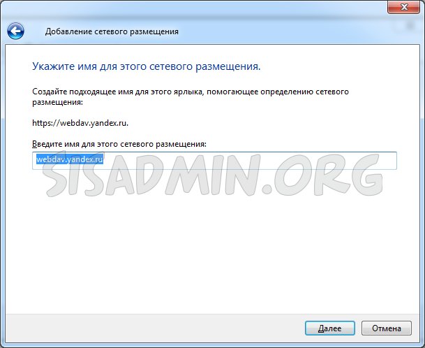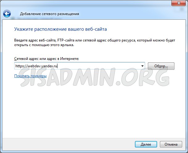 - В поле «Сетевой адрес или адрес в Интернете» вводим https://webdav.yandex.ru, и нажимаем «далее».