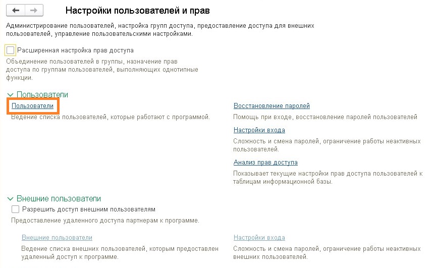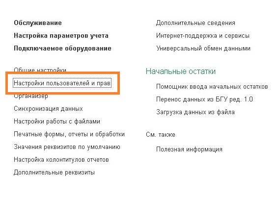 - Открываем «Настройки пользователей и прав».