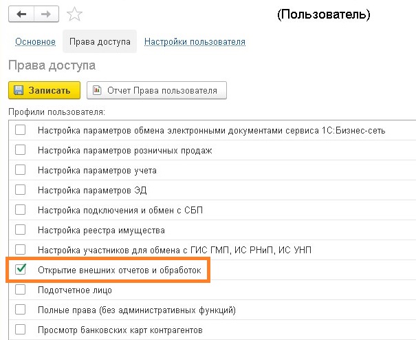 - В списке «Профили пользователя» ищем «Открытие внешних отчетов и обработок«, и отмечаем его галочкой. Затем, нажимаем на «Записать«.