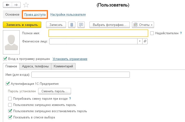 - В свойствах пользователя, открываем «Права доступа«.