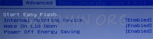 При включении нетбука нажимаем клавишу F2 и попадаем в BIOS, где выбираем раздел Advanced и выбираем самый верхний пункт Start Easy Flash.