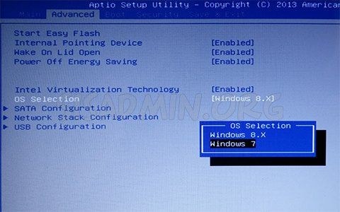 Теперь, нужно включить нетбук, нажать ту же клавишу F2, и в настройках BIOS опять переходим в Advanced, и видим там новый пункт OS Selection.
