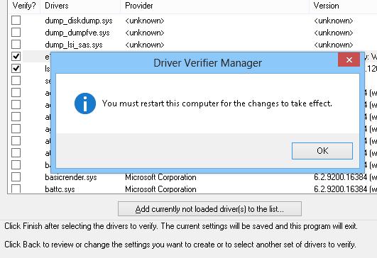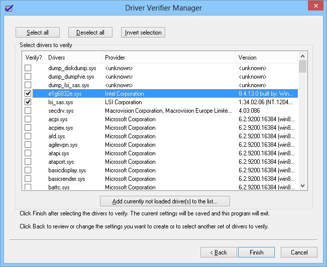 Отсортируйте содержимое таблицы, щелкнув по заголовку столбца «Provider» и в списке драйверов выберите те, которые необходимо протестировать. В нашем примере мы запустим проверку для всех драйверов, разработчиком которых не является Microsoft Corporation. Мы выбрали драйвера: e1g6032e.sys (Intel) и lsi_sas.sys (LSI).