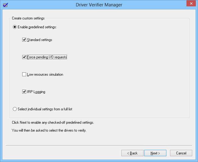 Убедитесь, что выбраны опции Standard settings, Force pending I/O requests и IRP Logging. Нажмите Next.