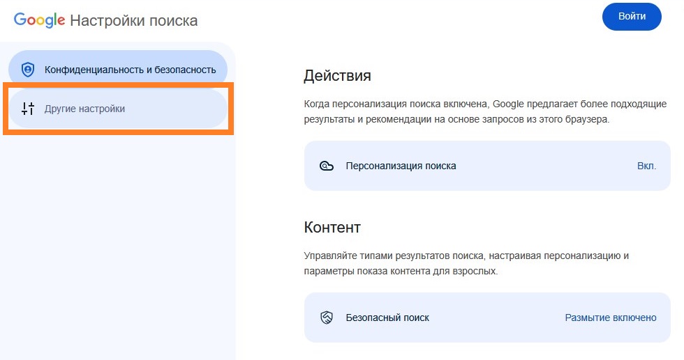 Изменение настроек Google