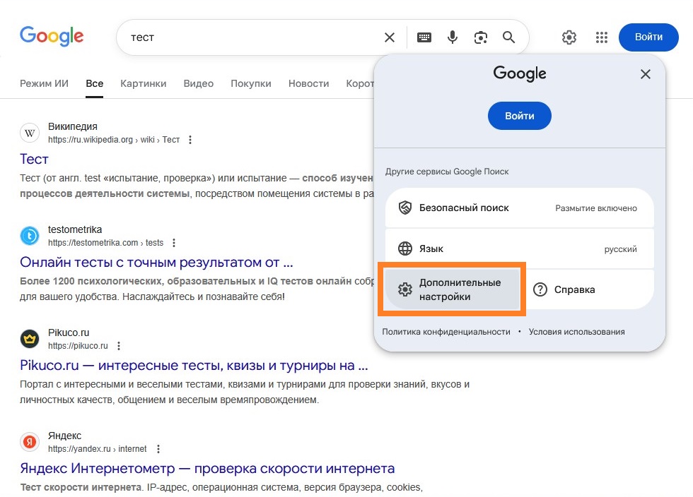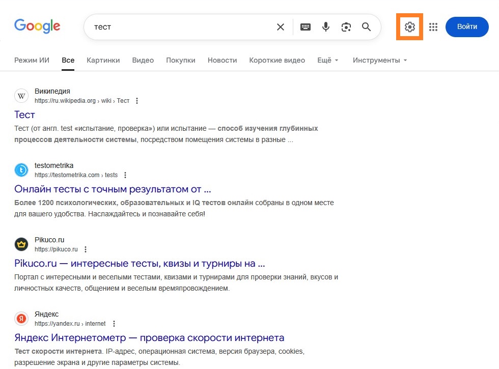 https://www.google.com), и выполнить там любой поисковый запрос. - В самом верху страницы, справа, найти значок шестеренки, который при наведении называется «Быстрые настройки», нажать на него.