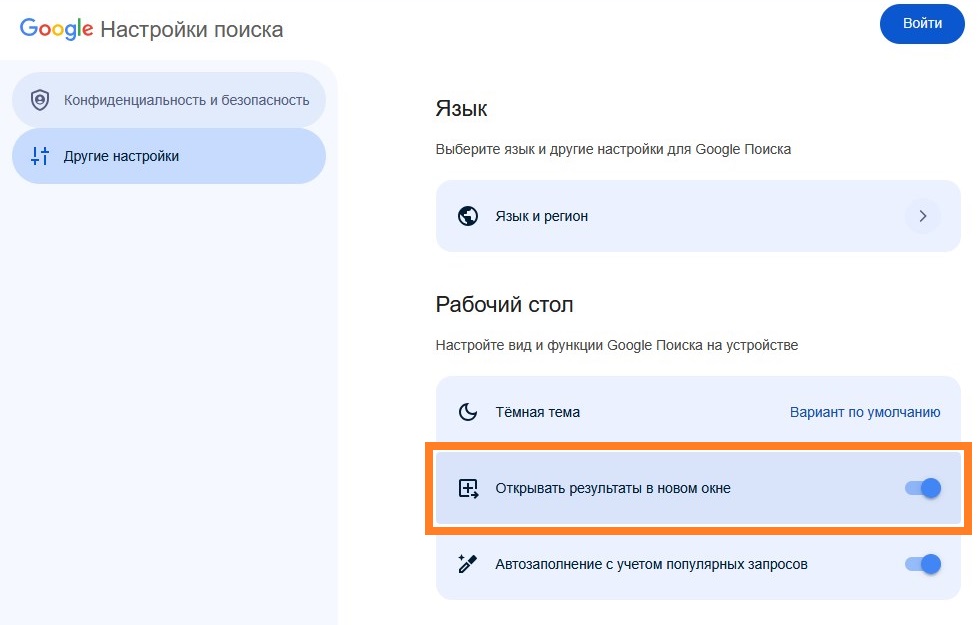 - Теперь нужно на странице с настройками найти пункт «Открывать результаты в новом окне», и переключить его переключатель во включенное положение.