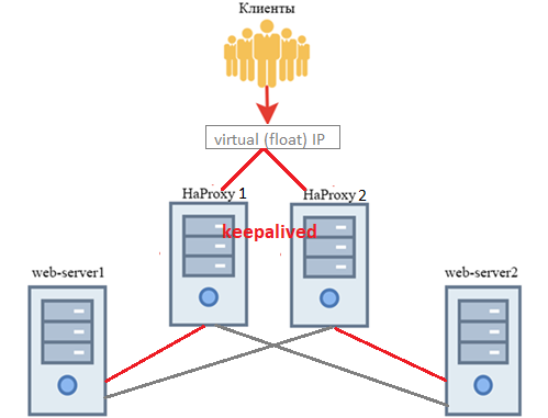 На этом наша настройка закончена. В статье мы рассмотрели базовую настройку HaProxy. В нашей схеме сервер-балансировщик нагрузки HaProxy становится единой точкой отказа. Для повышения отказоустойчивости конфигурации вы можете добавить второй сервер HaProxy, а проверку доступности между серверами организовать с помощью Keepalived. Получится примерно такая схема.