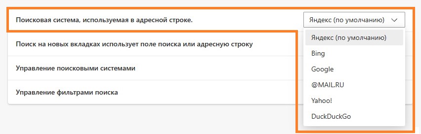 - Здесь будет параметр «Поисковая система, используемая в адресной строке.«, в которой можно установить желаемую поисковую систему. По умолчанию, там предоставлено множество популярных поисковых систем — Google, Яндекс, Mail.ru, DuckDuckGo и другие.