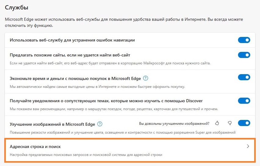 - В самом низу открывшихся параметров конфиденциальности, поиска и служб, находим группу настроек «Службы«, а в ней раздел «Адресная строка и поиск«. Нажимаем на него.
