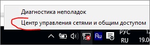 В правом нижнем углу кликните правой кнопкой мыши по значку сети — выберите Центр управления сетями и общим доступом
