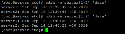pdsh -w server[1-2] 'date' — диапазон серверов в моем случае 2 сервера. Может быть от 1 до 20, выглядеть будет так: pdsh -w server[1-20] 'date'