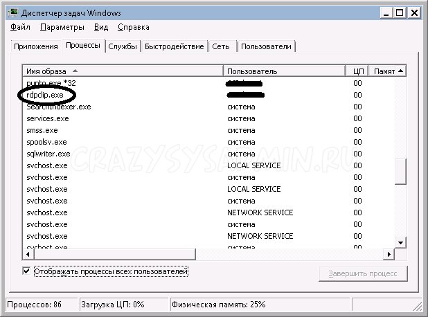 Выбираем данный процесс, запущенный под вашей учетной записью (это актуально для терминального сервера, т.к. под каждой учетной записью запускается rdpclip.exe) и убиваем его. Далее через диспетчер запускаем его снова: