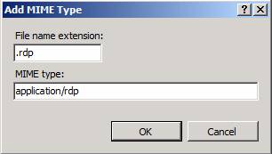 Есть еще один маленький нюанс. По умолчанию IIS не поддерживает работу с файлами, имеющими расширение RDP. Поэтому для корректной работы системы, необходимо добавить расширение rdp в настройки MIME Types в IIS в следующем формате:
