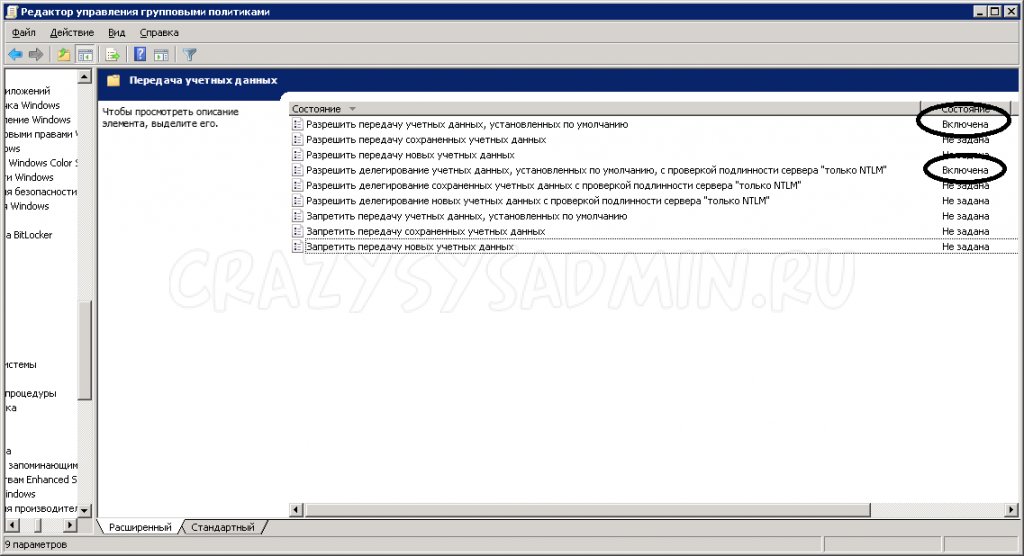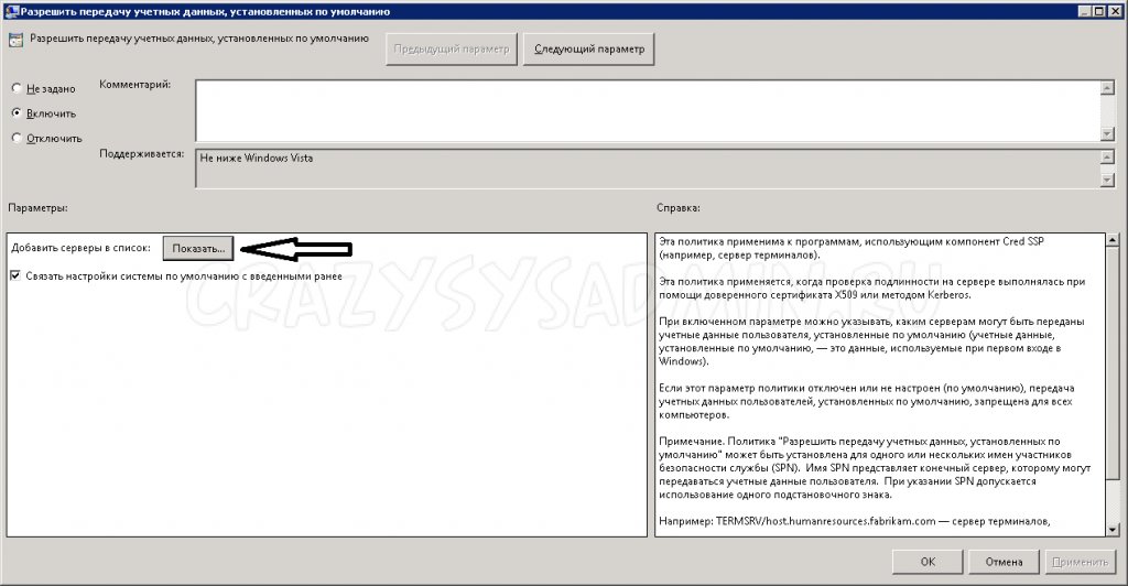 В ней настраиваем 2 параметра: Разрешить передачу учетных данных, установленных по умолчанию и Разрешить делегирование учетных данных, установленных по умолчанию, с проверкой подлинности сервера «только NTLM»
