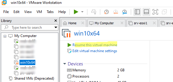 Заметил одну неприятную особенность в гипервизоре VMWare Workstation. Если вы не используете виртуальную машину в течении некоторого времени, она автоматически приостанавливается функцией Suspend. Чтобы продолжить использование ВМ приходится нажимать кнопку Resume this virtual machine.