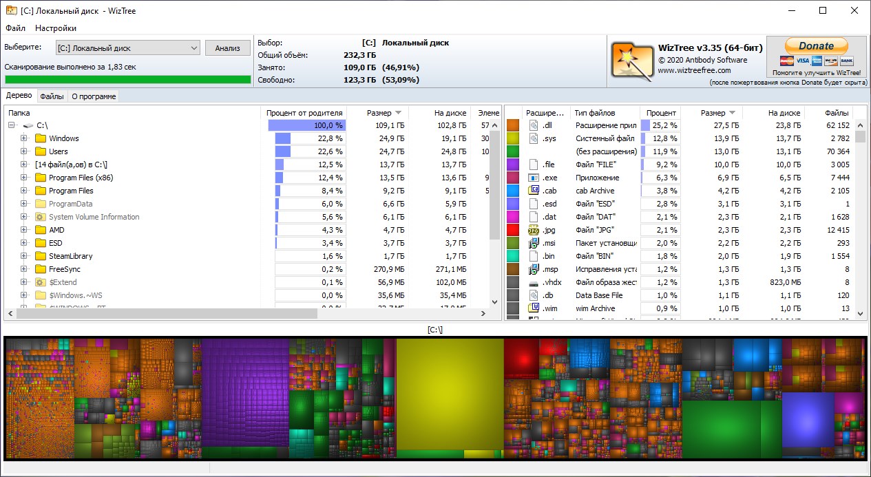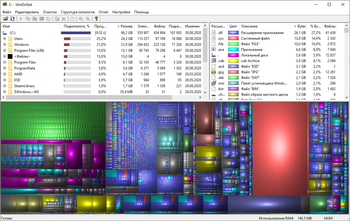 Одна из самых удобных утилит для анализа использования свободного места на накопителях — WinDirStat. Данная программа работает почти под любой версией Windows (начиная с Windows 95!), её интерфейс поддерживает множество языков (в том числе русский), и она абсолютно бесплатна.