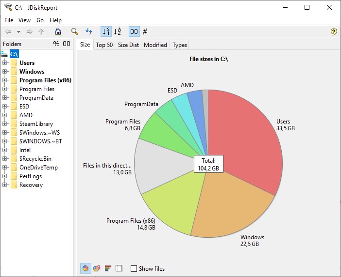 Очень простая в использовании программа. Сразу после запуска, нужно выбрать в верхнем меню раздел «File» — «Choose Directory…», и выбрать желаемый раздел диска, или папку, для анализа занятого/свободного пространства. Результаты будут отображены в таблице с диаграммой, при этом можно раскрать каждый каталог, и посмотреть что именно и сколько из его содержимого занимает места. Так же есть портативная версия программы.