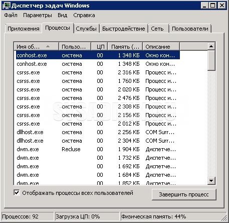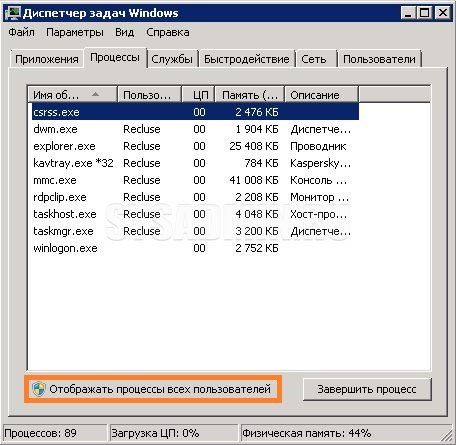 Нужно перейти в Диспетчере задач на вкладку «Процессы», и нажать на кнопку «Отображать процессы всех пользователей».