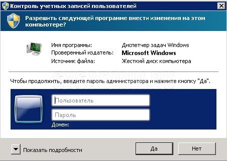Если у вашей учетной записи есть права администратора на данном компьютере или сервере, то отобразятся процессы всех пользователей, и Диспетчер задач перейдет в режим работы от имени администратора. Если же у вас таких прав нет, то появится окошко запроса на повышение прав, в котором будет предложено ввести данные учетной записи, с правами администратора.