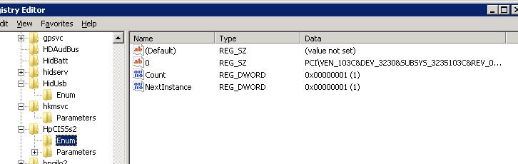 2) В моем случае он нашелся в ветке HKEY_LOAL_MACHINESYSTEMControlSet001servicesHpCISSs2