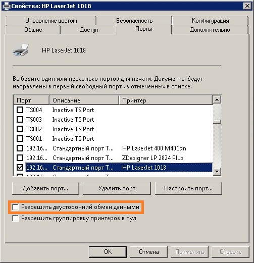 При использовании данных принтеров, которые были подключены через lp_server под операционной системой Windows Server 2008 R2, была выявлена неприятная особенность — при отправке на печать задания, принтер начинал его бесконечно печатать. Для исправления этого недоразумения, необходимо в настройках принтера отключить двухсторонний обмен данными.