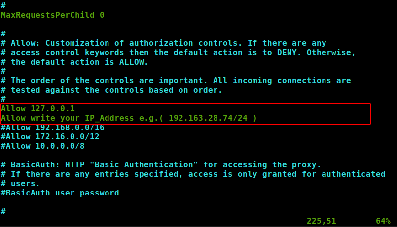 Tinyproxy позволяет вам добавлять или блокировать IP-адрес пользователя или диапазон IP-адресов от использования tinyproxy. Чтобы разрешить или заблокировать IP-адрес пользователя, перейдите в строку Allow 127.0.0.1 и ниже этой строки добавьте IP-адреса, которые вы хотите разрешить [IP_Address]. Чтобы разрешить диапазон IP-адресов чуть ниже строки Разрешить 192.168.0.0, добавьте строку